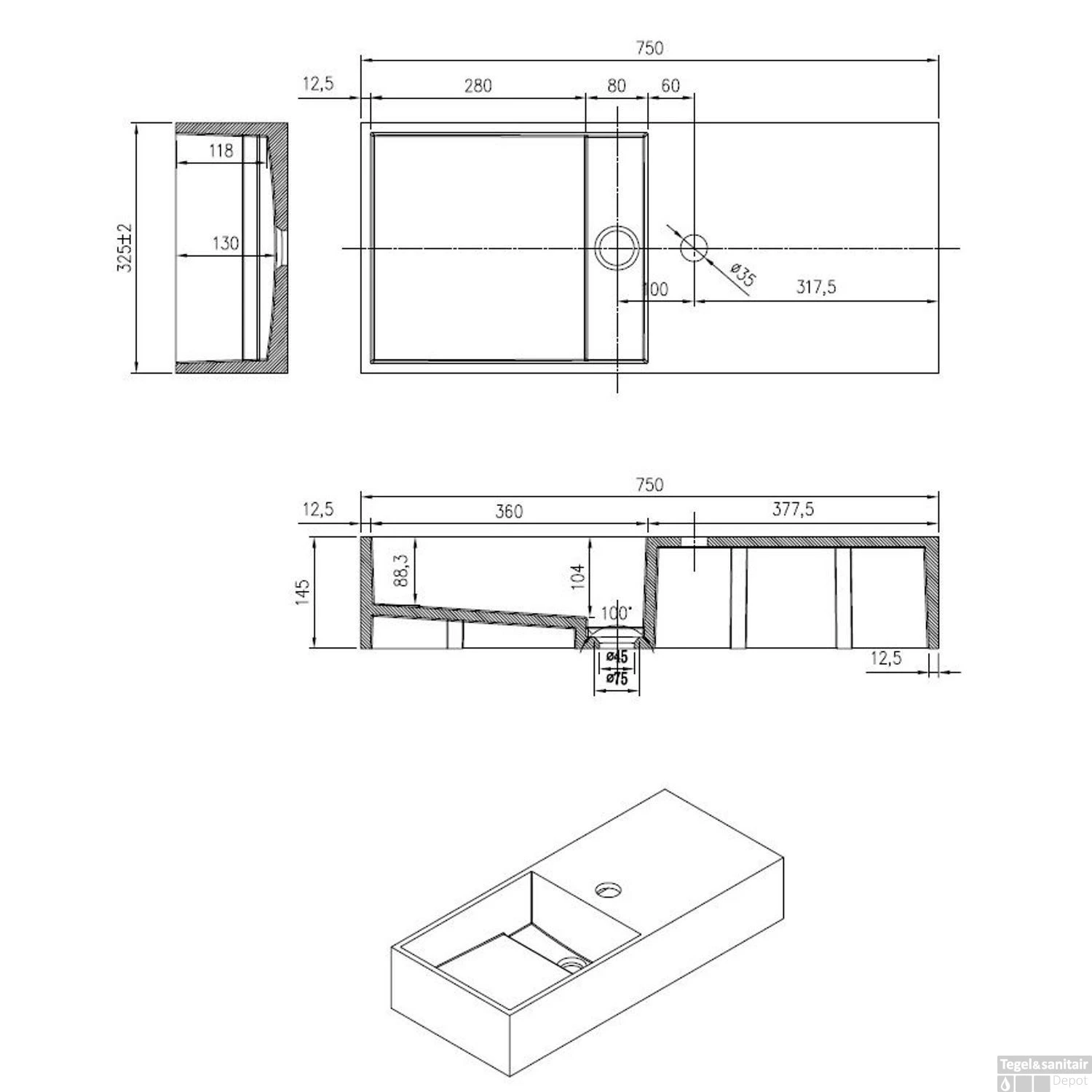 Bent u op zoek naar een bijzonder model wastafel voor in uw toiletruimte? Zoek dan niet verder! Dit fraaie exemplaar van 75 cm breed heeft zijn bijzondere uiterlijk te danken aan het ruime plateau aan de rechter kant. U kunt aan de rand van het plateau een kraan plaatsen maar het voordeel van dit design is dat u zelf kunt kiezen of er een kraangat komt of niet. Er zit een markering waarmee u zelf een kraangat kunt maken. U kunt er ook voor kiezen om het dicht te laten met als idee dat u geen opbouw kraan kiest maar een mooie inbouw kraan.