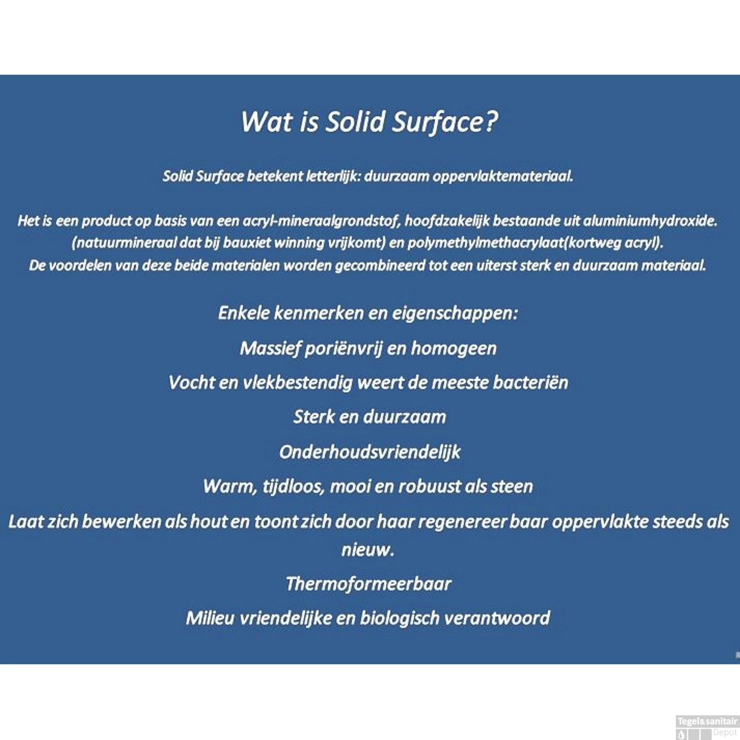 De N75 Just Solid wastafel van het merk Best Design heeft zoals gezegd een breedte van 75 cm, terwijl de diepte 33 cm bedraagt en de hoogte 15 cm. De wastafel is gemaakt van het materiaal solid surface en is afgewerkt in de kleur mat wit. Solid surface heeft als grote voordelen dat de wastafel vocht- en vlekbestendig is, bacteriën geweerd worden en dat het oppervlak er altijd als nieuw uitziet. Bovendien is solid surface een milieuvriendelijk materiaal. De wastafel wordt geleverd inclusief bevestigingsmateriaal en een afvoerwaste.